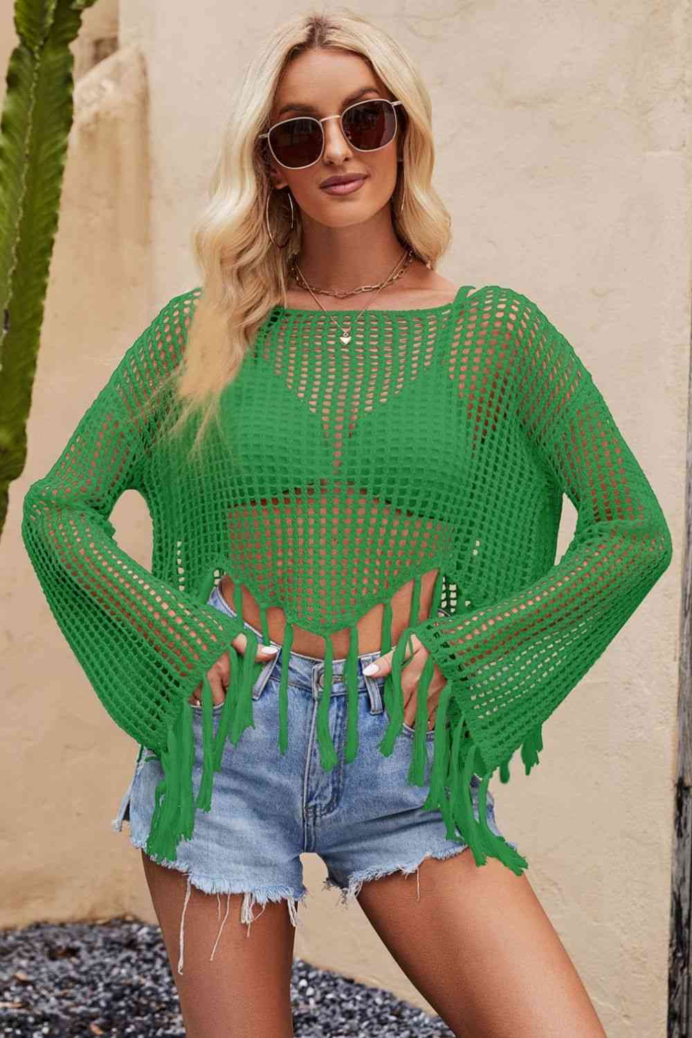 Tassel Hem Openwork Long Sleeve Cover Up